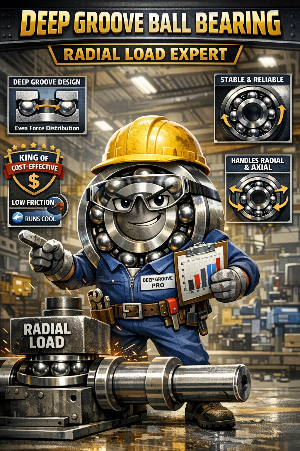 การออกแบบตลับลูกปืนเม็ดกลมร่องลึกมีความชาญฉลาดมาก วงแหวนด้านในและด้านนอกแต่ละวงมีรางวงกลมคล้าย "ร่องลึก" และมีลูกบอลเหล็กฝังอยู่ภายใน เมื่อออกแรงกดที่เพลาจากด้านข้าง ลูกเหล็กจะถูกยึดไว้อย่างแน่นหนาที่กึ่งกลางของรางทั้งสอง ส่งผลให้มีการกระจายแรงที่สม่ำเสมอมาก